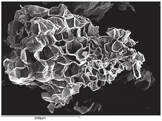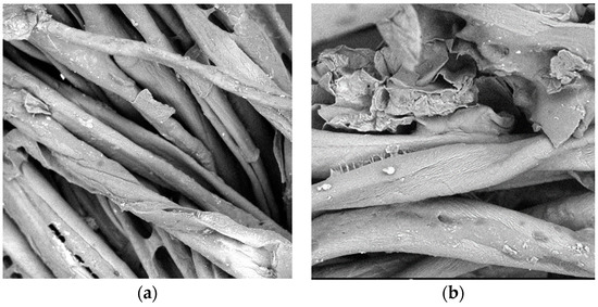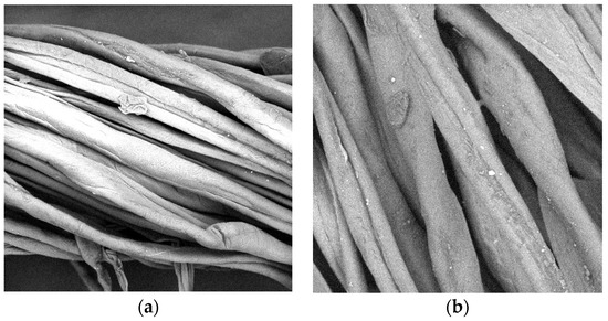 In contrast, the SEM images at two different magnifications of the 90:10 cotton–cork blend showed no cork deposition on the warp yarns and a coating of granular cork of uneven size on the weft yarns, applied with the help of a binding polymer (Figure 7 and Figure 8).