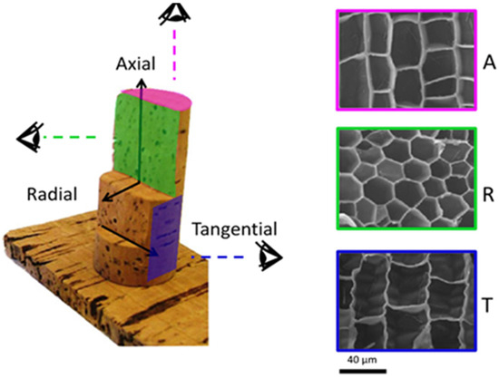 Cork with different microstructures in all three axial, radial, and tangential directions. Reprinted with permission from ref. [7]. Copyright 2017 John Wiley & Sons, Ltd. (Hoboken, NJ, USA).