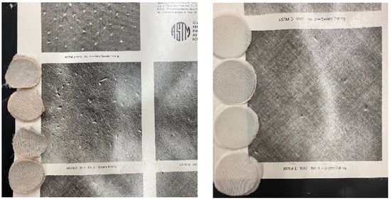 An abrasion resistance test using the SDL Martindale M235 abrasion test was performed following the ASTM D3512 [24] test procedure on the samples. The cotton–cork blended sample had a slub yarn appearance in the weft direction, due to the cork coated on cotton yarns at different uneven intervals. There was a significant change in the abrasion resistance of cotton–cork blended samples after 5000 cycles, as seen in Figure 3 left, as the rating for the blended samples was an average of 2.5, compared to that of the 100% cotton samples, as seen in Figure 3 right, which had an average rating of 4.5.