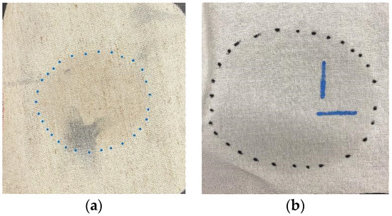 The moisture management test was performed using an SDL ATLAS M290 instrument, (SDL Atlas, Rockhill, SC, USA). Although the cotton–cork blend had a lower absorption rate than 100% cotton muslin, it was still very absorbent. Figure 5a indicates the maximum wetted radius for 90:10 cotton–cork blended fabric, and Figure 5b indicates the maximum wetted radius of 100% cotton muslin fabric. The test indicated that the cotton–cork blended fabric had good absorbency, as the top and bottom max wetted radius was 20 mm, compared to the top and bottom wetted radius for 100% cotton, which was 30 mm. Fabric breathability and humidity were also indicated by the moisture management data, since good absorbency signals the amorphous content of the fiber and the ability of the textile material to allow the movement of moisture within the polymer structure of the fiber.