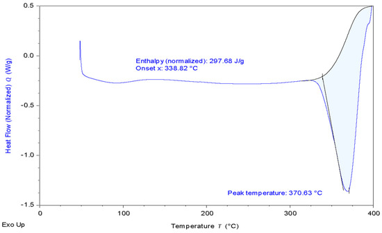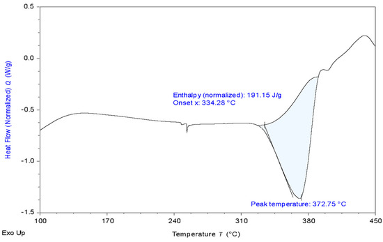Differential scanning calorimetry is a thermo-analytical technique used in studying the properties of materials with temperature changes. A DSC instrument, TA DSC2-01167 (TA Instruments, New Castle, DE, USA), was used to obtain the thermograph of cotton yarns coated with synthetic polymers. The x-axis of the graph represents the temperature, and the y-axis represents heat flow divided by the sample weight. The temperature range used was 40–450 °C, with a nitrogen atmosphere. The sample was heated and cooled at 10 °C.min−1. Endothermic transition energy was noted as 191.15 J/g for the polymer in the weft yarn and 297.68 J/g for the polymer in the warp yarn, which was higher compared to regular low-melting synthetic polymers, indicating the polymer present in both the yarns to be a high-performing polymer with a high degree of polymerization, requiring higher heat to melt. The melting point Tm of the binder polymer was observed to be 372.75 °C in the weft yarn, as seen in Figure 9, and 370.63 °C in the warp yarn, as seen in Figure 10, which indicated the presence of a high-performance, high-melting synthetic polymer in both sets of yarns in the cotton–cork blended sample. As per the DSC thermograph seen in Figure 9 and Figure 10, it was observed that the onset of glass transition temperature Tg for the polymer binders started in the region of 150 °C and continued to rise with the temperature [20]. The high-performance thermoplastic polymer category with a Tm of approximately 370–373 °C was shortlisted to be a category of high-melting aromatic thermoplastics called polyarylene ether, whose melting temperatures can range between 345–390 °C [27,28,29,30]. Some commercial examples of polyarylene ether are UDEL® (polysulfone), Kadel® (polyketone), Radel® (polyarylsulfone), PEEK® (polyetheretherketone), and Victrex® PES (polyethersulfone) [30]. Polyarylene ether polymers have excellent heat tolerance, dimensional stability, excellent chemical and hydrolysis resistance, and excellent mechanical properties [31]. They are employed in a variety of applications, such as adhesives, coatings, composite matrices, moldings, toughening agents, and ultrafiltration membranes [30].
