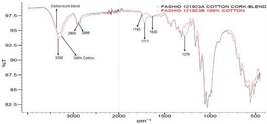 FTIR spectra of the 90:10 cotton–cork blended fabric (in black) and 100% cotton muslin (in red).