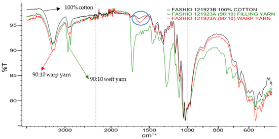 As previously explained (Figure 12 and Figure 13), the FTIR spectra of the 100% cotton and cotton–cork blended fabrics are different, and particularly, the FTIR spectra of the weft of the cotton–cork blend show significantly different peaks, due to the presence of the synthetic polymer and cork. This is further illustrated in Figure 14. In Figure 14, the spectra in black are 100% cotton fabric, the spectra in red are of the warp yarn of the 90:10 cotton–cork blended fabric, and the spectra in green are of the weft yarn of the 90:10 cotton–cork blended fabric. Because the warp yarns of the cotton–cork blend have been coated with the synthetic polymer, it indicates a change in the peak between the 1700 cm−1 to 1500 cm−1 peak region (indicated by the circle in Figure 14). The SEM micrographs, DSC graphs, and FTIR spectra all corroborate the presence of the polymer.