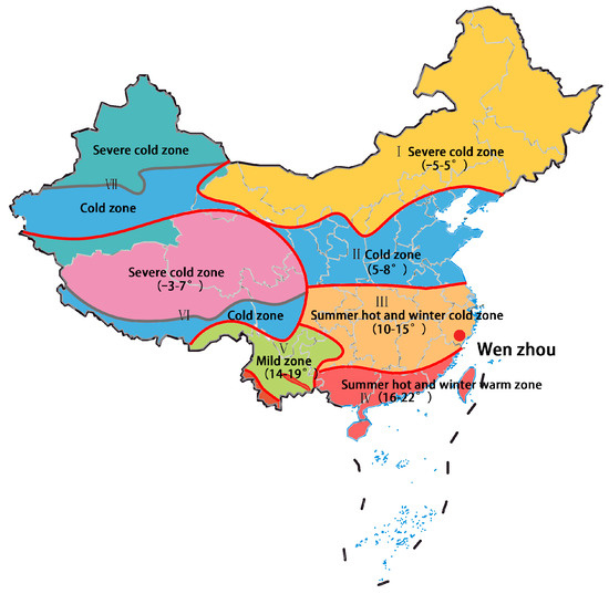 China’s vast geography contributes to a rich diversity of climatic types, each playing a critical role in architectural design and posing direct influences on the comfort of the building’s internal environment and its energy efficiency. Thus, it is meaningful to obtain a profound understanding of climatic influences so as to develop and duplicate various advanced solar building technologies. Therefore, architectural and technological applications may vary among climatic zones. The building to be studied is located in Wenzhou, Zhejiang Province, China, which falls into the hot-summer and cold-winter climatic zone (Figure 1) as per the Residential Building Design Code (GB J96-86) [1]. Natural ventilation is considered a prevalent strategy for improving indoor air quality and reducing building energy consumption in modern architecture, and Trombe walls represent a typical passive solar technology that effectively enhances natural ventilation and convection [2,3,4], which can effectively improve the indoor air environment. Compared to mechanical ventilation, natural ventilation has garnered attention from many scholars by taking significant energy-saving advantages with broad application prospects in transitional seasons and various climatic zones. Trombe wall structures utilize solar radiation to power airflow and combine ventilation techniques with modern solar energy utilization to deliver optimal ventilation performance [5], being seamlessly integrated into various architectural designs [6], balancing aesthetic and practical values [7].