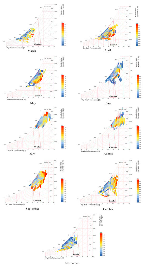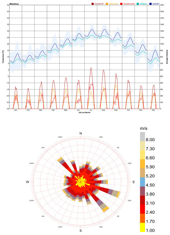 Figure 18 vividly illustrates the environmental impact of the Trombe wall in the current study. This article introduces the Ladybug tools plugin in Rhino7 Grasshopper software for indoor thermal comfort simulation. This plugin can handle climate information while also simulating indoor thermal comfort, excluding winter. During this process, actual wind speed data from the Trombe wall were incorporated, enabling a more accurate representation of its effects. The charts clearly demonstrate that the temperature and humidity during transitional seasons can be maintained within a relatively comfortable range with the application of the Trombe wall in hot-summer and cold-winter climate zones. Taking the Wenzhou area as an example, the annual average temperature is approximately 18.5 °C, with annual average relative humidity ranging between 74% and 85%.