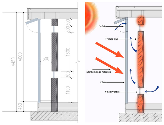 As depicted in Figure 4, the Trombe wall represents a thickness of 0.08 m, with its heat-absorbing surface painted black. The 7 mm double-layered tempered glass in the southern wall enhances the insulating effect within the chimney passage, thereby promoting convection. The cavity of the Trombe wall measures 0.5 m in width, and both the inlet and outlet of the chimney system are equipped with adjustable glass covers. The building’s overall dimensions are 1.2 m in length, 4.5 m in width, and 4 m in height, offering excellent insulation properties. The physical properties and parameters of various materials inside the building are shown in Table 1. Under the influence of solar radiation, the air within the Trombe wall chimney passage generates an upward buoyant force due to thermal pressure. When the chimney passage is connected with the interior of the building, the movement of indoor air is induced, thereby enhancing the building’s natural ventilation.