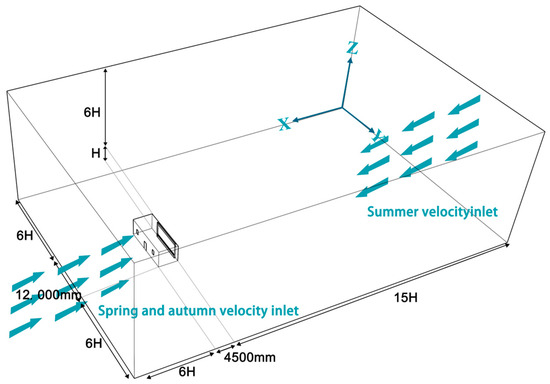 The computational domain size in this study is defined by the model height H. Following the “Chinese Standard for the Calculation of Green Performance of Civil Buildings” [26] and the experimental approaches proposed by Franke et al. (2007) [27] and Tominaga et al. (2008) [28], a combined indoor–outdoor simulation method is employed. As shown in Figure 6, the vertical height from the top of the subject building to the upper boundary of the computational domain is 6H. The distance from the outer edge of the building to the horizontal boundary of the computational domain is also 6H. The blockage rate of the computational cross-section perpendicular to the main flow direction is 2.97%. The horizontal distance from the inflow and outflow boundary to the outer edge of the building is 6H and 15H, respectively.