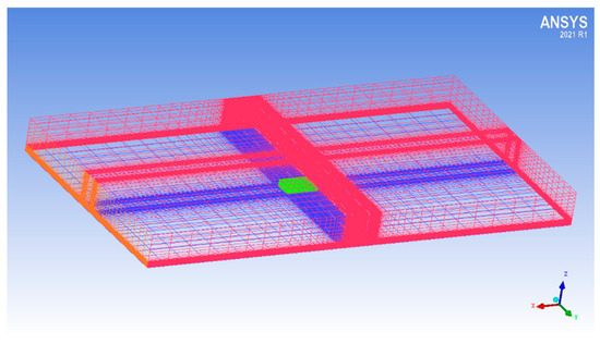 In this work, the performance of Trombe wall-driven indoor ventilation was simulated using the CFD software ANSYS FLUENT 2021 R1. This paper applied the pre- and postprocessing of its software ANSYSICIC 2021 R1 to establish the physical model of the Trombe wall building and mesh delineation. The dimensions of the Trombe wall and the building are based on actual architectural measurements, with the wall having a thickness of 0.08 m, a length of 6 m, and a total width of 0.58 m. The heights and lengths of the upper (or lower) exhaust ports are 1.1 m and 3.8 m, respectively. The overall dimensions of the building are 12 m in length, 4.5 m in width, and 4 m in height. The detailed structural parameters of the Trombe wall are illustrated in Figure 5.