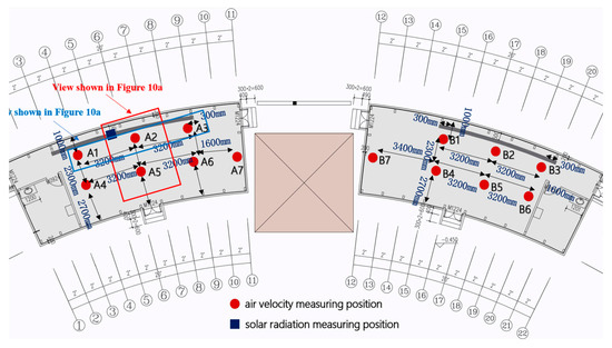 This comprehensive measurement approach evaluates the ventilation effect inside the building after the installation of the Trombe wall. Additionally, solar radiation and temperature–humidity monitoring points are placed on the exterior surface of the wall to monitor solar radiation and temperature–humidity levels in real time. The placement of these points is illustrated in Figure 11.