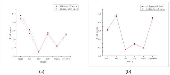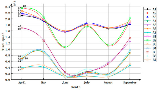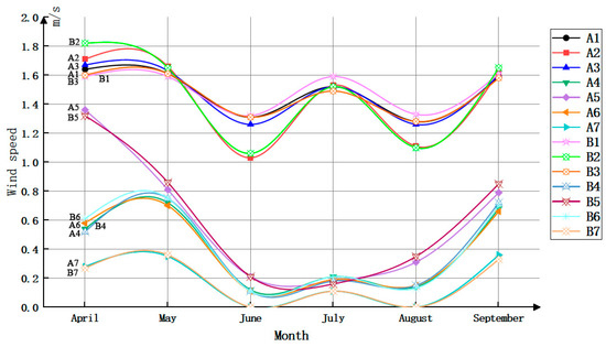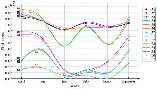 The experiment was conducted from 21 April to 10 October 2023. In order to account for the thermal storage capability of the Trombe wall, measurements were taken on the 21st day of each month at three different times: 9:00 a.m., 12:00 p.m., and 3:00 p.m. The chosen time slots corresponded to periods when the prevailing wind direction was predominantly northerly in April, May, and September and southerly in June, July, and August. Each month exhibited varying average wind speeds. The measurement duration at each individual point was 3–5 min. The speeds at all monitoring points were collected synchronously and in real time. Data were recorded continuously at 5 s intervals within each minute to obtain the average wind speed for that minute. This process was repeated three times for a one-minute average wind speed test, with a three-minute interval between each repetition. The wind speed for each monitoring point was calculated as the average of these three sets of wind speed data. All recorded data are provided in Table 4.