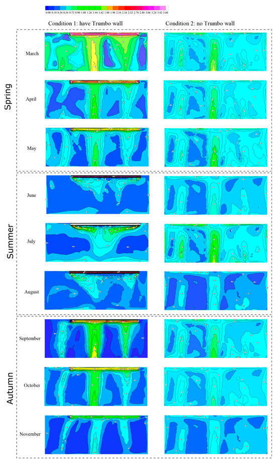 Figure 14 illustrates the wind speed contours at a height of 1.5 m inside the building. As can be clearly seen from the figure, the installation of the Trombe wall generally increases indoor wind speed, particularly where air convection around the wall is intense, significantly enhancing ventilation. Moreover, the indoor airflow exhibits a clear directional flow, with higher wind speeds in the area influenced by the Trombe wall. Notably, the wind speed changes are more pronounced within a 1.1 m distance from the ventilation port. This increase in wind speed at the wall opening is also evident in the measured data, though the effect diminishes towards the central area of the building. However, it still manages to increase wind speed by 0.2 m/s–0.8 m/s. The average indoor wind speed from March to November, respectively, increases by 0.35 m/s, 0.42 m/s, 0.68 m/s, −0.41 m/s, −0.2 m/s, −0.14 m/s, 0.8 m/s, 0.32 m/s, and 0.27 m/s. Measurements indicate that wind speed at the inlet of the Trombe wall increases by 0.9 m/s at least and 3.6 m/s at most. Data fitting suggests that the ventilation in May and September is particularly effective. The impact of the Trombe wall on the indoor still air zone is not as pronounced, with an approximate increase of 0.08 m/s in wind speed.