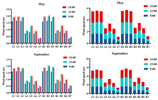 The chart also includes a thermal comfort range established using the PMV (predicted mean vote) model, which accounts for varying clothing conditions across different seasons and assumes a default standing posture. The thermal comfort range indicates that while summer thermal comfort remains relatively low with the application of the Trombe wall, comfort is higher in spring, autumn, and transitional seasons. Notably, May and September show the highest proportions of thermal comfort, accounting for 47% and 45% of the comfort range, respectively. These months are considered the most comfortable periods throughout the year following the application of the Trombe wall. Additionally, the ventilation performance in May and September is also relatively good. Figure 19 presents wind speed statistics and overlay charts for these months, indicating minor fluctuations in wind speed at points A1, A2, A3, B1, B2, and B3. This suggests a relatively stable convective effect at the inlet of the Trombe wall, with strong guiding performance. However, the central part of the building shows greater variability in wind speeds due to the diminishing influence of the Trombe wall, with impact varying at various points. The central area experiences higher wind speeds, while the sides have lower speeds, but the trend remains fairly consistent in May and September. Notably, air zone points A7 and B7 still register considerable wind speeds in these months, demonstrating the exemplary performance of the Trombe wall in transitional seasons.