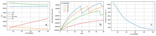 Figure 2 explains the effect of Activation Cost (AC) added to the MILP model (see Equation (4)) and its connection to BESS aging. Essentially, the AC value represents the minimum price difference required for executing a charge and discharge cycle to be advantageous. The division by 2 in Equation (4) precisely aligns the AC value with the buy-and-sell price difference. A high AC value corresponds to a low number of cycles, and vice versa (Figure 2c). However, a low number of cycles results in lower earnings in EA (Figure 2a). These effects can be evaluated over several years considering the Net Present Value (NPV) evolution (Figure 2b). Year after year, the available battery capacity decreases, and so does the cash flow. When end of life is reached, the battery needs to be replaced (decline steps in Figure 2b). As explained in the next paragraph, in the calculation of the NPV, a replacement is included as an additional cost that is subtracted from the regular cash. For this reason, in the year of replacement, the cash flow is negative, and in fact, there are “decline-steps” in the NPV graph in corresponding to the years when replacement is necessary. With high AC values, the battery ages more rapidly, but annual earnings are higher; with low AC values, the battery lasts longer, but the earnings are lower.