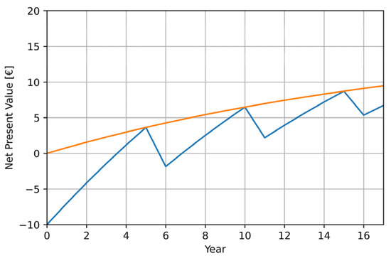 The transformation used for NPV can be explained by observing Figure 4. The investment presented by the NPV line in blue can be transformed into the equivalent investment of the orange line, which does not have discontinuity due to the lack of replacement of the initial investment, which is equal to zero. To compute the transformation, it is essential to consider that both the initial investment cost and the replacement costs are not paid upfront. Instead, they are financed through a loan with a duration equivalent to the battery’s lifespan and a loan interest rate chosen so that the original NPV and the transformed NPV are equal in the years when replacements occur. Thus, the transformed Cash Flow (CF*) for the transformed NPV must be recalculated with respect such conditions. Equations (12)–(15) synthesize how the NPV transformation can be calculated, where LF is the Loan Factor to be considered in the transformed cash flow.