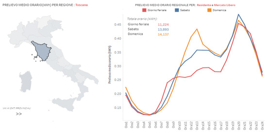 To calculate the Esur and Eneed of the REC, in addition to the photovoltaic production series, the aggregated consumption series of all community customers is required. A load series representing a 3 kWp typical residential consumers from Tuscany is generated by utilizing average hourly profiles provided by the Italian regulatory authority [51] (Figure 7). These profiles are differentiated based on the month and the type of day. The resulting load series is subsequently scaled by the number of customers within the considered REC, aggregating the total consumption pattern.