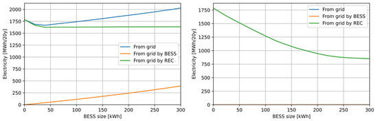 Figure 10 and Figure 11 underscore a key revelation from this study. The REC’s reliance on the grid, considering the BESS as part of the REC, paradoxically rises instead of declining. Over a 20-year span, both the energy fed into and withdrawn from the grid increase due to the battery’s independent EA activities, notwithstanding decreases in energy exchange within the REC. To address this, the approach advocated in the right-hand graphs restricts the battery to charge solely from the REC surplus and discharge solely to meet community needs. This strategy of non-EA reduces overall energy fed into and withdrawn from the grid, thus mitigating REC energy dependence.