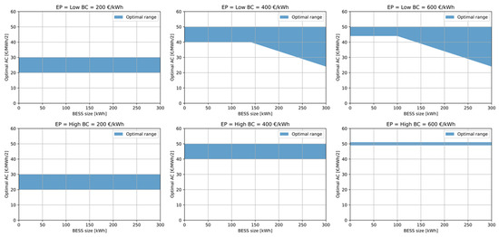 In scenarios using EA (Figure 15), a BESS cost of 600 EUR/kWh renders BESS installation economically unviable, while 400 EUR/kWh proves attractive, especially in scenarios with high energy prices. A larger BESS size is recommended for setups with a substantial surplus, while scenarios with low energy prices favor smaller BESS units. A cost of 200 EUR/kWh strikes a balance, rendering BESS integration cost-efficient across various scenarios.