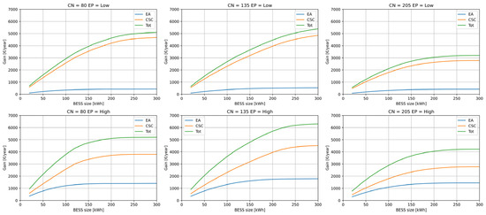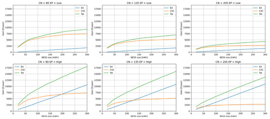 The analysis reveals that in scenarios featuring EA (Figure 13) and characterized by low energy prices, the gain derived from CSC significantly surpasses that of EA, exceeding it by approximately fivefold. Consequently, investments in such scenarios are primarily driven by REC incentives and are contingent upon the evolution of customer numbers over time. In other words, it is crucial to match the BESS to a REC with a lot of energy surplus. However, with high energy prices, the profit from EA may indeed outstrip that from CSC.