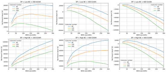 CSC: NPV* varying Energy Price (EP), BESS cost (BC), number of customers, and BESS size.