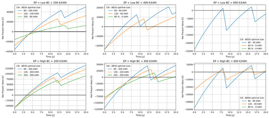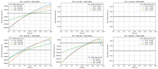 Figure 17 and Figure 18 provide further clarity by illustrating the progression of NPV, focusing on the original NPV rather than the transformed version and considering the optimal BESS size solution for each scenario. These curves offer a comprehensive perspective on investments, encompassing NPV, payback time, and battery lifetime.