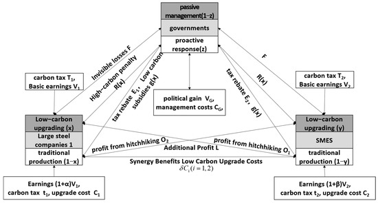 Under the implementation of the CBAM, there exists a competitive game relationship between large-scale steel enterprises and small- and medium-sized steel enterprises, with the government serving as a market guide and providing relevant policy and financial support as a crucial external force. Therefore, the model includes three participants: large-scale steel enterprises, small- and medium-sized steel enterprises, and the government. They all make independent decisions under bounded rationality to maximize their own interests. Large-scale and small- and medium-sized steel enterprises face the CBAM and government management by deciding whether or not to undergo low-carbon upgrades. The government, as a key external force, can choose whether or not to proactively address the CBAM and formulate its own decisions. Since all three parties need to satisfy their own profits, their strategic choices will also be dynamic. Using an evolutionary game model to identify the evolutionary stable points among the three parties is crucial in understanding how to better respond to the CBAM. The logical relationship among the three entities is illustrated in Figure 1.