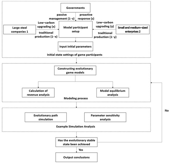 This framework is particularly suited for analyzing the competitive–cooperative relationships between different types of steel enterprises and governmental actions. Zhou et al. [32] studied the relationship between government intervention and low-carbon innovation technology by constructing a three-way evolutionary model. Meng et al. [33] built a three-way evolutionary model between the government and the shipping industry, analyzing the impact of government regulation on energy-saving and emission reduction strategies in the shipping industry. Yuan et al. [34] analyzed the relationship between the government and prefabricated housing construction by constructing a three-way evolutionary model, proposing a mechanism for promoting prefabricated housing construction. In recent years, evolutionary game theory has also been widely applied to the steel industry. Zhang et al. [35] constructed an evolutionary model of pollution coordination governance among steel enterprises under the carbon quota trading mechanism. Liu et al. [36] analyzed the game relationship between steel enterprises, scrap steel enterprises, and the government from the perspective of evolutionary game theory, deriving corresponding behavioral strategies. Zhang et al. [37] simulated the relationship between Chinese iron and steel enterprises and international iron ore enterprises to provide the basis for strategic choices in iron ore negotiations. Lin et al. [38] used the method of evolutionary game theory to analyze the interactive relationship between steel enterprises and the government in the post-pandemic era, offering policy recommendations for the sustainable development of steel enterprises.