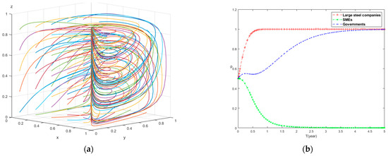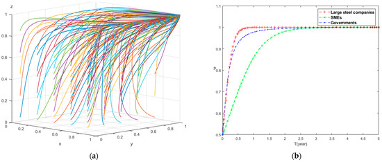 Based on the simulated parameters during the window stage, Figure 4a shows the evolutionary trajectories of the three players over 80 iterations, while Figure 4b presents the evolution trends of the relevant stakeholders with different colored lines. From the graph, it can be observed that different initial strategies eventually converge to the point, indicating the the ESS for the large steel enterprise, small- and medium-sized steel enterprise, and government is adopting low-carbon upgrade, maintaining traditional production, and passive management. This effectively validates the theoretical analysis in Section 4.2. This indicates that during the window period before the CBAM is launched, factors such as export volume, free-riding benefits, and the cost of low-carbon upgrades inhibit the choice of a low-carbon upgrade strategy by small- and medium-sized enterprises. The lack of clarity in government policies and the insufficient awareness of the implicit losses caused by high-carbon enterprises lead to an inclination among enterprises to adopt a passive wait-and-see approach. Large enterprises, being the first to be impacted by the CBAM due to their export business, tend to choose low-carbon upgrades.
