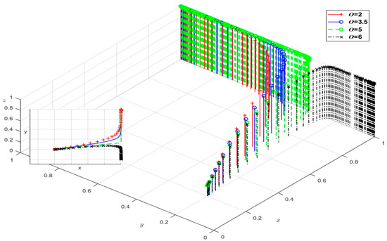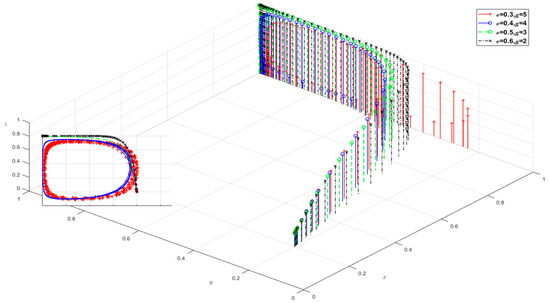 According to the arguments presented in the papers by Wainwright [52] and Lyapunov [53], to determine whether or not a stable point is an asymptotically stable point in the dynamic evolutionary system, it must exhibit a pure Nash equilibrium strategy balance. Therefore, temporarily ignoring the mixed strategy point, , the analysis will focus on the remaining eight equilibrium points. Secondly, based on Lyapunov’s method for system stability determination [54], when all eigenvalues of the Jacobian matrix of the evolution model are negative, the point is an asymptotically stable point. When at least one eigenvalue is positive, the equilibrium point is unstable. If there are eigenvalues equal to 0 with the rest being negative, the stability of the point cannot be determined, indicating a saddle point. Using the above methods and the system’s dynamic system, the Jacobian matrix can be obtained: