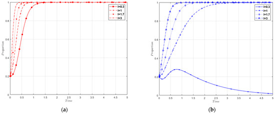Assumption 3: Currently, there is a stronger market demand for products produced through low-carbon processes in the global steel market. Consumers are willing to pay higher prices for environmentally friendly low-carbon products instead of regular products [41]. If one enterprise chooses the low-carbon production mode while the other adheres to traditional production, the enterprise implementing low-carbon production gains additional income, denoted as L. When both enterprises choose low-carbon production, the two enterprises compete at the same level, and hence, neither receives additional income. Additionally, government subsidies for dynamic low-carbon initiatives to enterprises are directly proportional to the share of low-carbon enterprises [42]. The subsidy amount for enterprises is represented by , where is the maximum subsidy amount, and is the proportion of low-carbon enterprises. Similarly, under increased government intervention, there will be dynamic penalties for high-carbon enterprises, i.e., those enterprises still using traditional production methods. The government’s penalty intensity for high-carbon enterprises is also related to the proportion of enterprises using traditional production methods, represented by the penalty function , where is the maximum penalty amount.