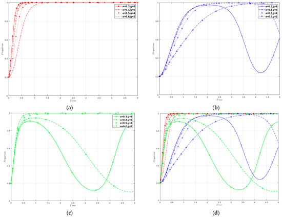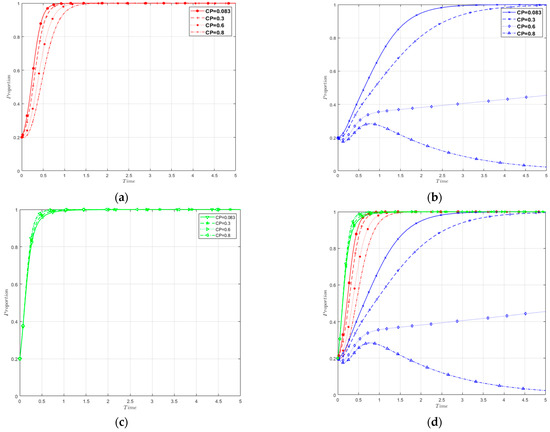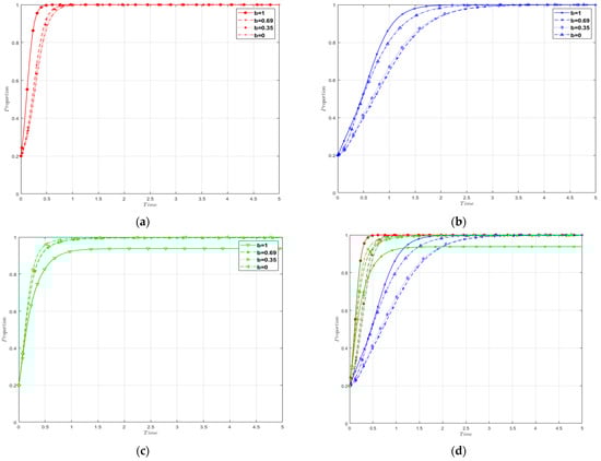 According to the implementation phase shown in Table 4, each parameter corresponds to instances and stable conditions, including , and . By generating evolution paths over time for different initial strategies using MATLAB2019a, as shown in Figure 6a, it can be observed that after multiple iterations, the path ultimately converges to (1, 1, 1), indicating that the ESS for the implementation phase is . This phase signifies that, with the formal implementation of the CBAM, businesses, influenced by carbon taxes and government regulations, opt for low-carbon upgrading strategies. Simultaneously, the government plays a regulatory and incentivizing role in the implementation phase, mitigating the impact of the CBAM and benefiting from it, hence choosing an active response strategy.