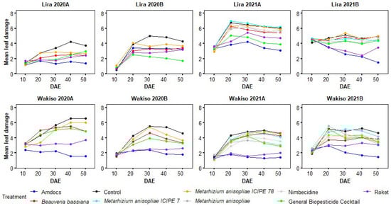 In 2020B, in Lira, leaf damage was lowest in plots treated with Nimbecidine®. In the same district, lower damage levels were observed in plots treated with Amdocs®, Roket® and B. bassiana. The damage in the M. anisopliae-treated plot was higher and similar to that of the untreated control. In Wakiso, similar—and the lowest—damage levels were recorded in plots treated with Amdocs® and Roket®, whilst the control registered the highest damage. Damage in the plots treated with the two biopesticides and Nimbecidine® were similar (Table 2).