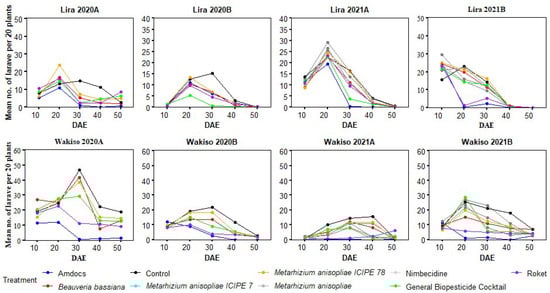 There were significant (p < 0.05) differences in larval abundance between the treatments in Lira at 30 and 40 DAE (2020A), 30 DAE (2020B and 2021A), and at 20 and 30 DAE (2021B). In Wakiso, significant differences occurred in larval abundance between the treatments at 30 to 50 DAE (2020A), 30 and 40 DAE (2020B), 40 DAE (2021A), and 20 and 40 DAE (in 2021B) (Figure 2).