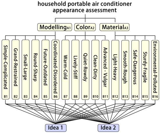 This study applies Kansei engineering and FAHP to extract, assess, and analyze the visual features of portable household air conditioners. The initial step involves selecting an appropriate product for investigation. This is followed by utilizing existing online tools to extract user comments about the product and processing them to obtain adjectives related to its appearance. Using pictorial samples, these adjectives are filtered with a questionnaire, and the final phrases are constructed using the semantic differential method. Subsequently, evaluation systems are developed for each factor through FAHP, and the factors are sorted according to their relative weights. The results are organized into different plans that are evaluated and validated using FCE. The research process is depicted in