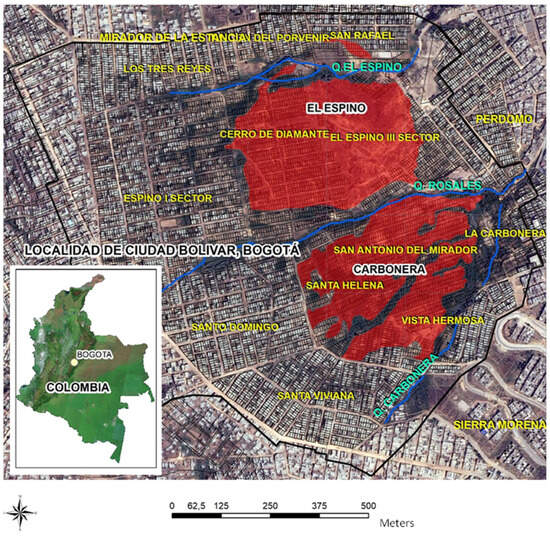 The study site (4°34′56.8″ N, 74°10′37.1″ W), ‘Altos de la Estancia’ (AE), was situated southwest of Bogota in ‘Ciudad Bolívar’ (CB). It was distinguished by rocky terrain unsuitable for intensive agriculture, influencing its historical occupation and peripheral status in the 19th century. During the Republic era (1819–1831), city structuring decisions favored the northern zone with better-endowed public services, leaving southern settlements, including AE, underdeveloped. AE served as a site for construction material extraction, supplying gravel, clay, and sand for urbanization. However, informal occupation in hazard-prone areas, vulnerable to landslides exacerbated by previous mining, ensued [48]. Morphodynamically, AE’s unstable zone encompassed two distinct landslide sectors: ‘El Espino’ to the north and ‘La Carbonera’ to the south, covering an approximate area of 110 ha (Figure 1) [49].