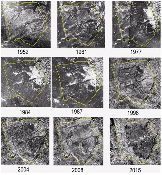 Spatiotemporal variation in the landslide zone under study (1952–2015). Yellow line: geographic boundary.