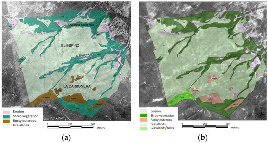 Land cover, land use, and morphology for the rural/natural scenario in the landslide area under study (1952–1961). (a) 1952 and (b) 1961.