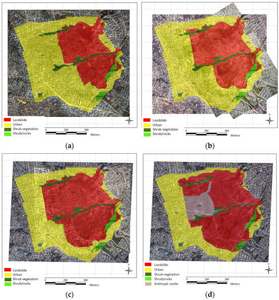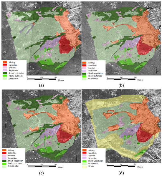 Change in land use, land cover, and morphology during the landslide risk scenario in the area under study (2004–2013). (a) 2004, (b) 2007, (c) 2010, and (d) 2013.