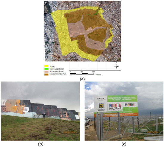 Subsequently, Decree 364 of 2013 established the ‘Altos de la Estancia District Park’ (Figure 7) [57]. In December 2012, the megacity administration completed the mitigation works in the EA zone, with an investment of USD 6.75 million. Water management systems were implemented, and live fences were planted [106]. In 2013, a project called the ‘Urban Improvement Plan’ was proposed for the AE zone, comprising intervention lines in land clearance, family resettlement, and housing improvement, with an estimated value of USD 19.3 million [108].