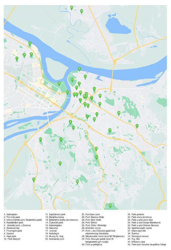 1]. Different measures worldwide included regulations on the maximum number of people in a public space, the maximum time spent outdoors, and social distancing measures. These regulations varied regionally, but they all had one thing in common—controlling the way and means of using open public spaces. The pandemic was declared in Serbia in March 2020, followed by regulations based on WHO suggestions and the country’s overall healthcare status. Between March and July 2020, the Serbian government implemented various social measures, such as restrictions and lockdowns, thus seriously transforming everyday life that could affect citizens’ physical and mental health [