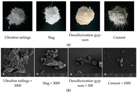 The ultrafine tailings and cementitious materials and the microstructure of the ultrafine tailings and cementitious materials. (a) The ultrafine tailings and cementitious materials, and (b) the microstructure of the ultrafine tailings and cementitious materials.
