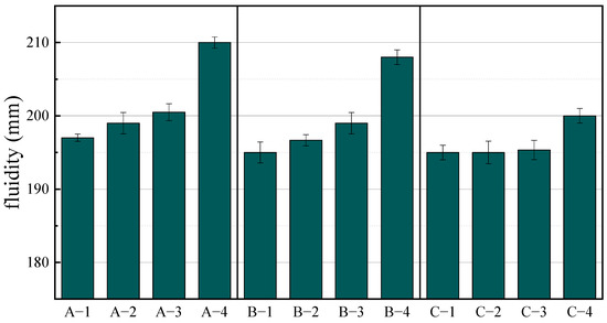 In Figure 4, the effect of the c/g ratio on the fluidity of the SCUPB was observed in groups A (where the proportion of the slag was 70%), B (where the proportion of the slag was 75%), and C (where the proportion of the slag was 80%). The fluidity of the SCUPB increased with the decrease of the c/g ratio, and the increase in the fluidity was most significant when the c/g ratio was 1:4, which indicates that desulfurization gypsum improves the fluidity of the paste. This is due to the larger particle size distribution of desulfurization gypsum. Some studies have reported that the introduction of coarse particles will reduce the attraction between the particles in the paste, and lead to the destruction of the aggregates formed by the ultrafine particles, thereby reducing the viscosity of the paste [24]. Therefore, desulfurized gypsum is helpful to improve the fluidity of the paste. In the C group (with a slag content of 80%), the fluidity of the paste does not vary significantly with the change in the c/g ratio (C-1, C-2, C-3), which may be due to the relatively small proportion of cement and desulfurized gypsum combined (20%). It is also found that the fluidity of the SCUPB paste decreases with the increase of the slag content. This is because the shape of slag is complex, the particle size is poor, and the surface is rough and porous, which increases the water requirement, thus reducing the fluidity of the SCUPB paste [25].