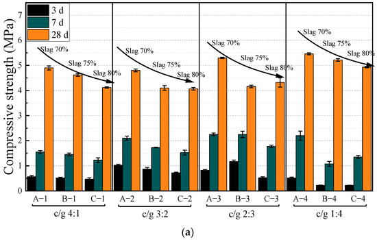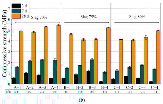 It also can be found in Figure 5b that, with the decrease of the c/g ratio, both the 3 days and 7 days compressive strength of the SCUPB first increases and then decreases. This is because in the slag–gypsum–cement system, in addition to the reaction of cement–desulfurization gypsum to activate the slag, the cement or desulfurization gypsum can also stimulate the hydration reaction of slag alone. With the constant total amount of cement and desulfurization gypsum, when the c/g ratio is 4:1 or 1:4, the content of the desulfurization gypsum or cement reduces. Therefore, after the composite activation of the slag by both the cement and gypsum, the hydration reaction quickly converts to a single activation by the cement or desulfurization gypsum. In contrast, when the c/g ratio is 3:2 or 2:3, the composite activation of the slag is the dominant reaction, so the compressive strength is higher, which is also similar to the report of Li et al. [32].