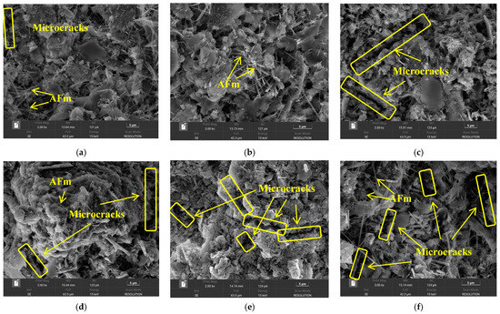 From the SEM images of the SCUPB after 28 days in Figure 6, it can be observed that there are lots of needle-like and flake-like hydration products around the ultrafine tailings particles. It can be observed that the structure of the SCUPB is relatively loose with a slag content of 80% (C-4), and there are a large number of micro-cracks near the tailings particles (Figure 6e,f). Furthermore, it can be observed from Figure 6 that as the slag content increases, the number of micro-cracks also increases. The possible reason is that, with the increase of the slag content, the total amount of cement and desulfurization gypsum decreases, resulting in a decrease in the amount of hydration products. This is consistent with the results of the tests on the compressive strength of the SCUPB, which decreases with the increase of slag content.