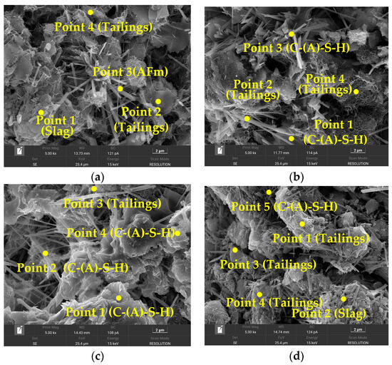 The SEM image and EDS results of the SCUPB A-4, B-1, B-4, and C-4 at 28 days are present in Figure 7 and Table 3. It can be found that the needle-like crystal of Afm, amorphous C-A-S-H, and C-S-H are dispersed in the system, and the hydration products are intertwined with the ultrafine tailings to form a dense cluster structure. Additionally, the main elements of Point 1 in sample A-4 (Figure 7a) and Point 2 in sample C-4 (Figure 7d) are Si, Al, O, and Mg, which can be judged as slag. It can be found that there are still raw materials with incomplete hydration reactions in the hardened paste, which may be related to the large number of ultrafine tailings particles in the system. Although the ultrafine tailings particles are intertwined with the hydration products, they will wrap the raw cementitious materials with an incomplete reaction and limit the development of the later strength [27]. This is also the reason for the slow growth of the later strength when the c/g ratio is 2:3 and 3:2.