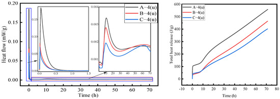 Three groups of A-4 (with a slag content of 70%), B-4 (a slag content of 75%), and C-4 (a slag content of 80%) were selected to observe the effect of the slag content on the hydration heat of the SCUPB (Figure 8). It can be found that the dissolution stage is 0–0.5 h, and the heat release rate in the dissolution stage gradually decreases with the increase of the slag content. Similarly, the peaks in the 5–15 h acceleration phase are also lowered with the increase of the slag content. As shown in Figure 8, the total amount of the 3 days heat release of SCUPB decreases with the increase of slag content, which corresponds to the results of the compressive strength tests.