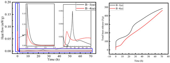 Samples B-1 (c/g = 4:1) and B-4 (c/g = 1:4) were selected to observe the effect of the c/g ratio on the hydration heat process of SCUPB (Figure 9). It can be found that, in the dissolution stage from 0–0.5 h, the maximum heat release rate of B-1 (u) is higher than that of B-4 (u). This is because the heat release rate of cement in the dissolution stage is higher than that of desulfurized gypsum. Thus, B-4 (u) enters the acceleration period earlier. However, when the dissolution reaction is carried out to a certain extent, the cementitious material particles are separated by the ultrafine tailings particles and wrapped by the hydration film, which hinders the hydration reaction and reduces the hydration reaction rate of UCPB, and the hydration reaction enters the induction period. Over some time, the encapsulated and isolated cementitious material particles continue to dissolve and slowly participate in the response, the concentration of the hydration product (C-S-H) or calcium hydroxide (CH) increases, and the pressure difference between the inside and outside of the hydration film increases. Then the hydration film breaks, and the hydration reaction enters the accelerated stage [36]. The B-1 (u) sample with more cement produces more hydration products in the dissolution stage, and the formation of the hydration film is takes longer, so the acceleration period is relatively slow. However, Figure 9 shows that the total amount of the 3 days heat release of B-1 (u) is higher than that of B-4 (u), which corresponds to the 3 days compressive strength results.
