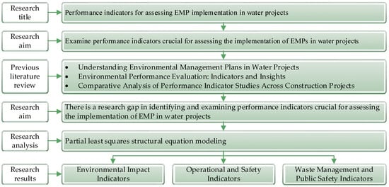 Despite the importance of having an environmental management plan, it has still not been fully implemented, especially in water projects. There has not yet been a study that examines the performance indicators that are crucial for assessing the implementation of environmental management plans in water projects. To fill this gap, this research aims to examine the performance indicators that are crucial for assessing the implementation of environmental management plans in water projects; this examination has the potential to offer valuable insights and advancements in the field. To achieve this aim, the research flow starts with a literature review to find previous works and to identify the research gap; this is followed by the research methodology, which consists of survey development, data collection, and data analysis. Then, the results are presented, followed by a discussion. Lastly, the research implications and conclusions are presented. Figure 1 below shows the conceptual framework of the study.