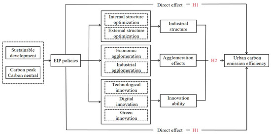 The aforementioned analysis leads to the inference that EIPs exert a favorable influence on UCEE. However, the precise mechanisms through which EIPs influence UCEE warrant meticulous examination. Based on institutional theory, this study constructed the research framework depicted in Figure 1. This study will undertake a thorough investigation into the implementation of EIP policies, delving into the multifaceted ways in which such policies bolster UCEE, specifically through their impact on industrial structure, innovation ability, and agglomeration effects.
