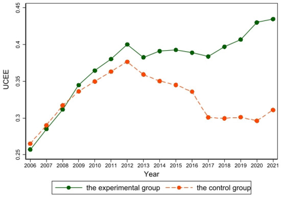 To visually ascertain the impact of EIP construction on UCEE, this study initially depicts the annual average carbon emission efficiency of both the experimental and control groups throughout the sample period in a time series graph, as illustrated in Figure 2. Broadly, the experimental group demonstrates a discernible upward trajectory over the analytical timeframe, whereas the control group displays fluctuations but also exhibits some growth compared to the initial period of the sample. A comparison between the two groups indicates that, prior to 2008, both maintained a synchronized trend in carbon emission efficiency, with the control group marginally outperforming the experimental group. However, post-2008, the UCEE of the experimental group notably surpasses that of the control group, with the gap between them progressively widening. This observation leads us to infer that the establishment of EIPs facilitates the enhancement of UCEE.