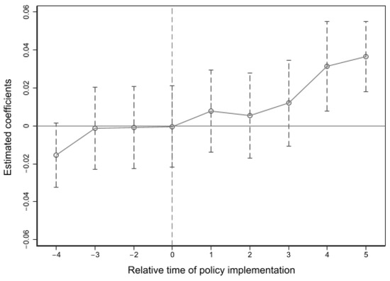 where current represents the time of implementation of the EIP policy in pilot cities, pre-4–pre-1 denotes the four years leading up to the implementation of the EIP policy, and after1–after5 indicates the five years following the implementation of the EIP policy. By observing the significance of the estimated coefficients for pre-4–pre-1, it is possible to determine whether the sample data pass the parallel trends test. Ideally, before the implementation of the EIP policy, there should be no significant difference in the trend of changes in UCEE between the experimental group and the control group, meaning that the estimated coefficients for pre-4–pre-1 are not significant.